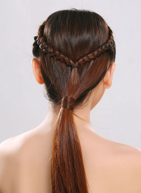 Dùng kẹp thẳng làm cho tóc được thẳng ra, sau đó bắt tóc đuôi sau thắt bím nhỏ, vòng lên trên theo hình dạng băng-đô (headband).