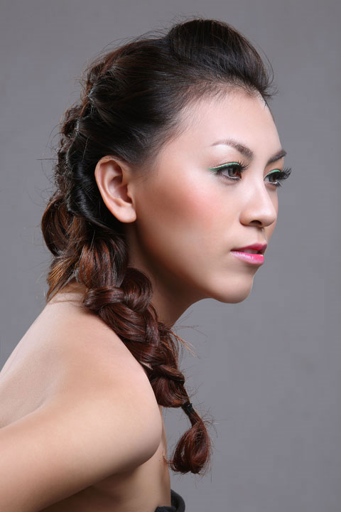 Dùng cây uốn tóc tạo một lớp bồng bềnh, sau đó phần mái tóc chia thành tứng tép nhỏ, tết tóc lại và để xéo qua 1 bên.