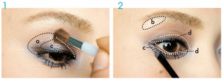 Vùng d: Dùng tăm bông hoặc cọ nhỏ để tán màu nâu sẫm cho vùng đường viền mi trên và dưới.