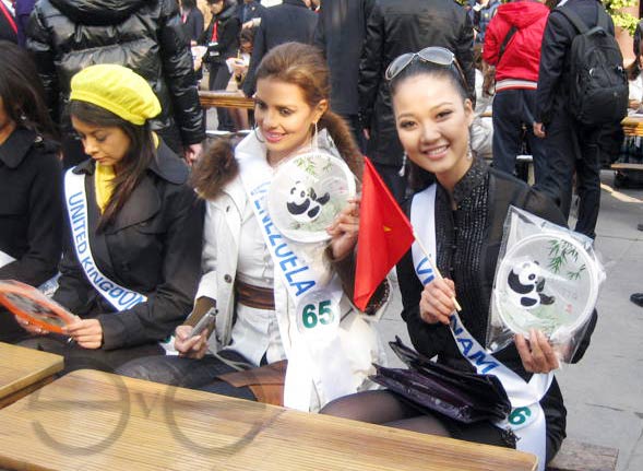 Sau buổi trình diễn tại Trung tâm Thương mại (Thành Đô), các thí sinh đã được BTC và nhà tài trợ tặng cho 3 đôi giày đồng phục. Đại diện VN Trần Thị Quỳnh rất hứng thú với đôi giày bọc lụa màu đỏ son nổi bật.