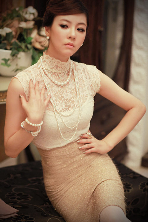 Áo ren cao cổ, trần tay đẹp mắt khi mix kèm chân váy tweed kết hợp kim tuyến.